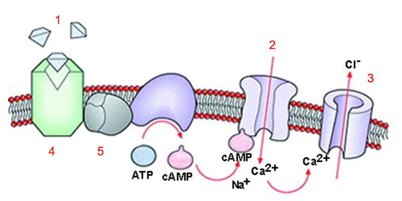 Qoxu molekullarının reseptorlarla birləşmələriylə qoxu alıcı hüceyrədə olduqca sürətli bir sürü əməliyyat başlayar. Əvvəlcə, G-olf zülalı aktiv vəziyyətə gəlir. Bu zülal, AC fermentini hərəkətə keçirər. AC fermenti, ATP-nin cAMP-ə çevrilməsini sürətləndirir. cAMP hüceyrədəki bir xəbərçidir və silya hüceyrə membranına birləşdirən kanallara bağlanır. Bu vəziyyət, kanalların açılmasına və kalsium ionlarının silyanın içinə girməsini təmin edər.